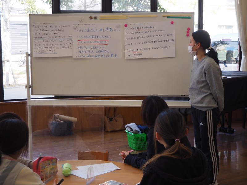 先日、堺市教育センターから講師をお招きし、「子供の人権を尊重する保育のために私たちが大切にしたいこと」をテーマに研修を行いました。事例について個々で考えた後、グループワーク、ディスカッションを通して、改めて互いの保育感を共有することが出来る良い機会になりました。