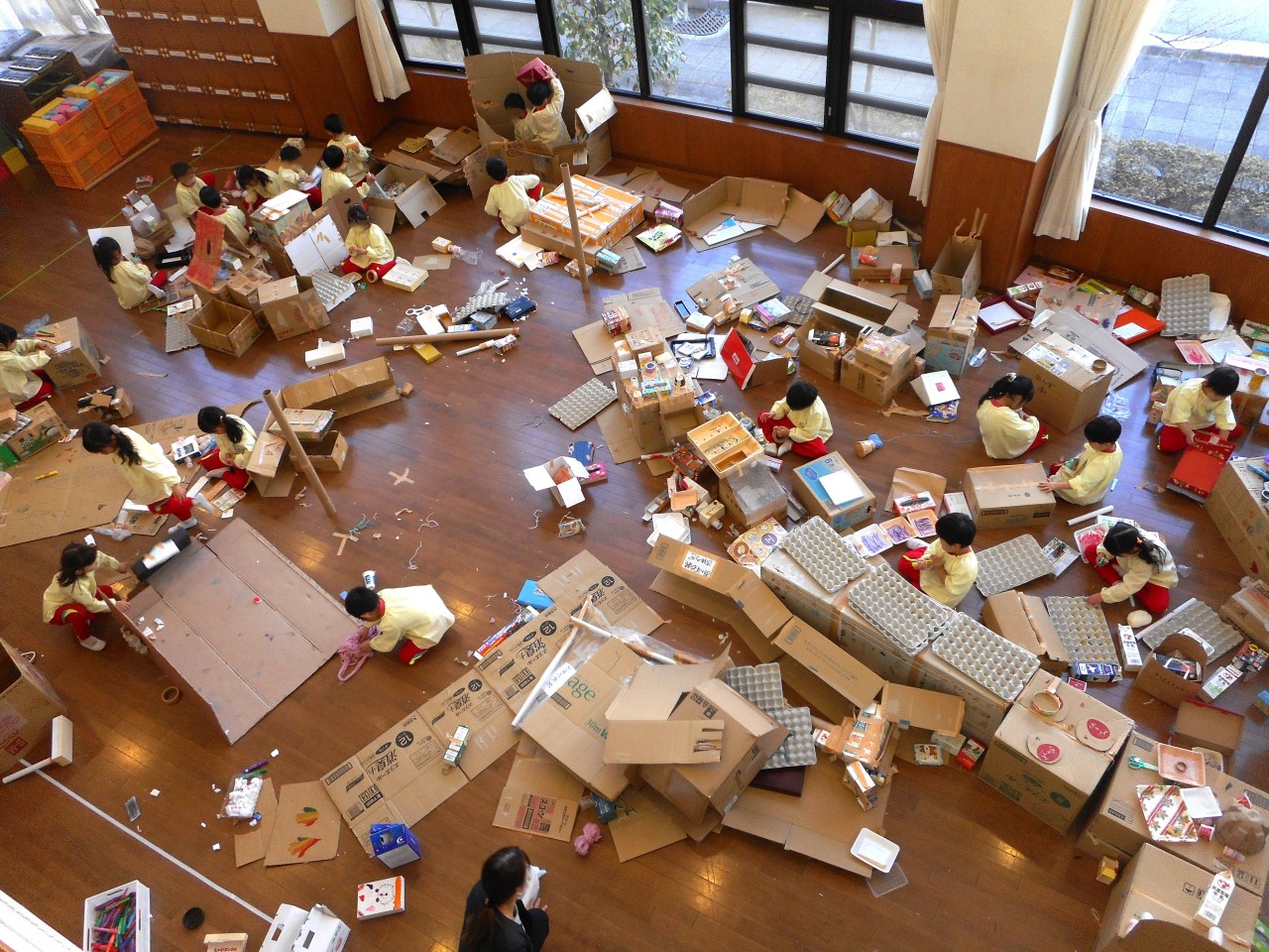 年末から年始にかけて5歳ぶどう組・4歳あんず組が造形遊びをしました。最初は何を作っていいのか分からず戸惑っていた子どもたち。日を追うごとに自分たちの作りたいものがイメージできる様になり、最終日にはホールが秘密基地のようになりました。