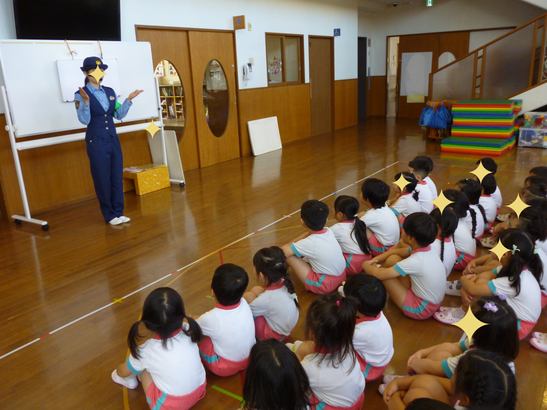 防犯警察があり、警察官の方に来ていただいて、不審者が来たときに、どうしたらいいのかを教えてもらいました☆